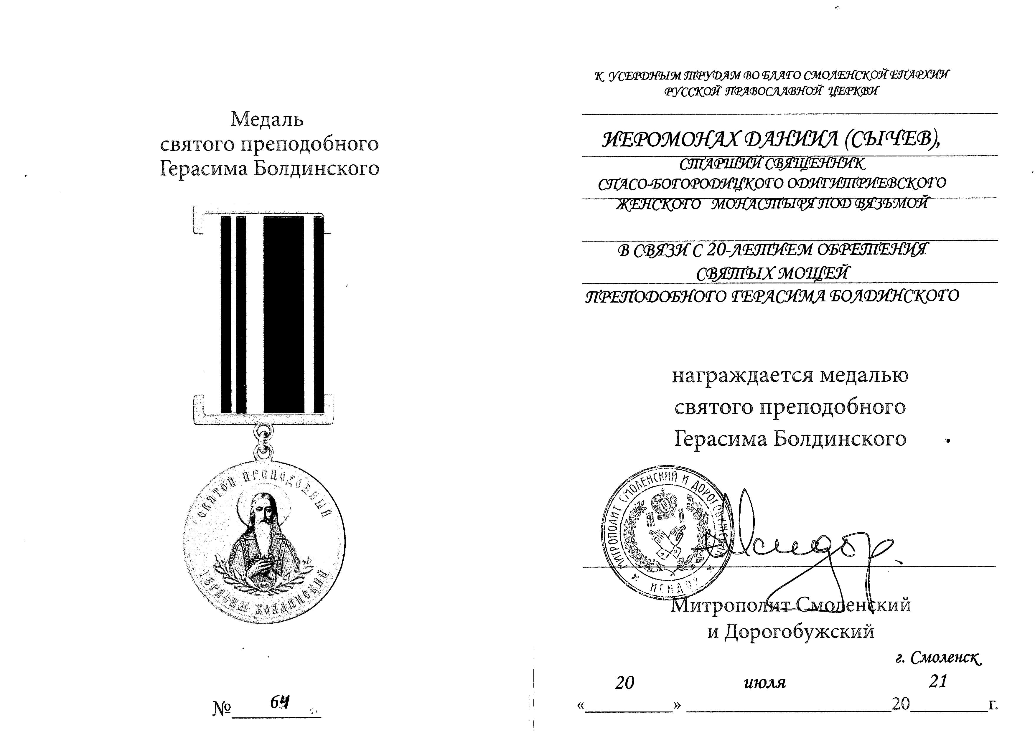 Среди удостоенных этой награды игумения Ангелина (Нестерова) и старший священник нашего монастыря иеромонах Даниил (Сычёв) у которого с обителью, основанной преподобным Герасимом Болдинским связаны первые годы монашеской жизни.